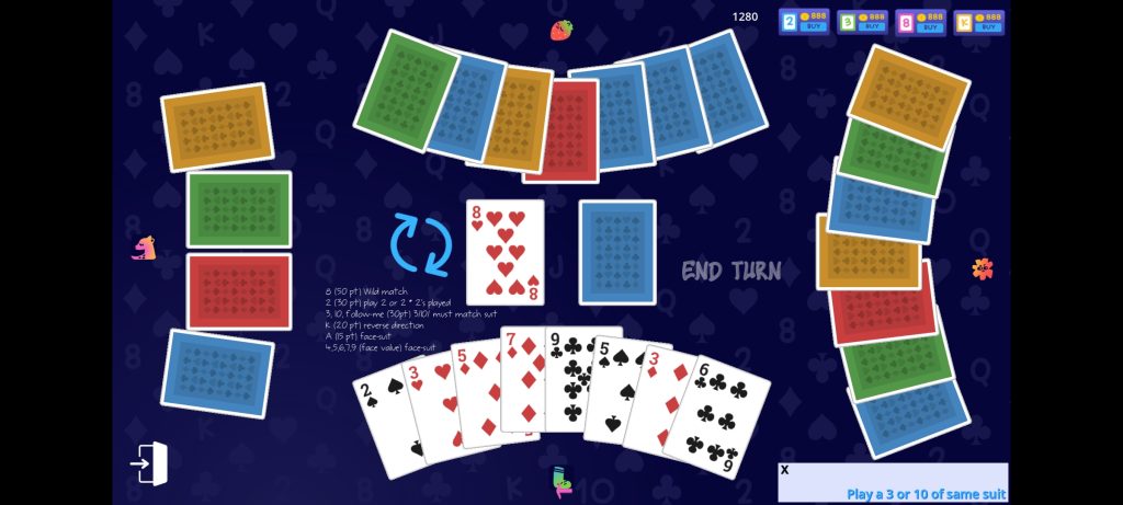 Welcome to the automated version of the card game Derange Order of Eight. Once you learn the special characteristics of a few of the cards the game, Derange Order of Eight can offer many hours of enjoyment. A family fun game you can learn and share with family and friends.